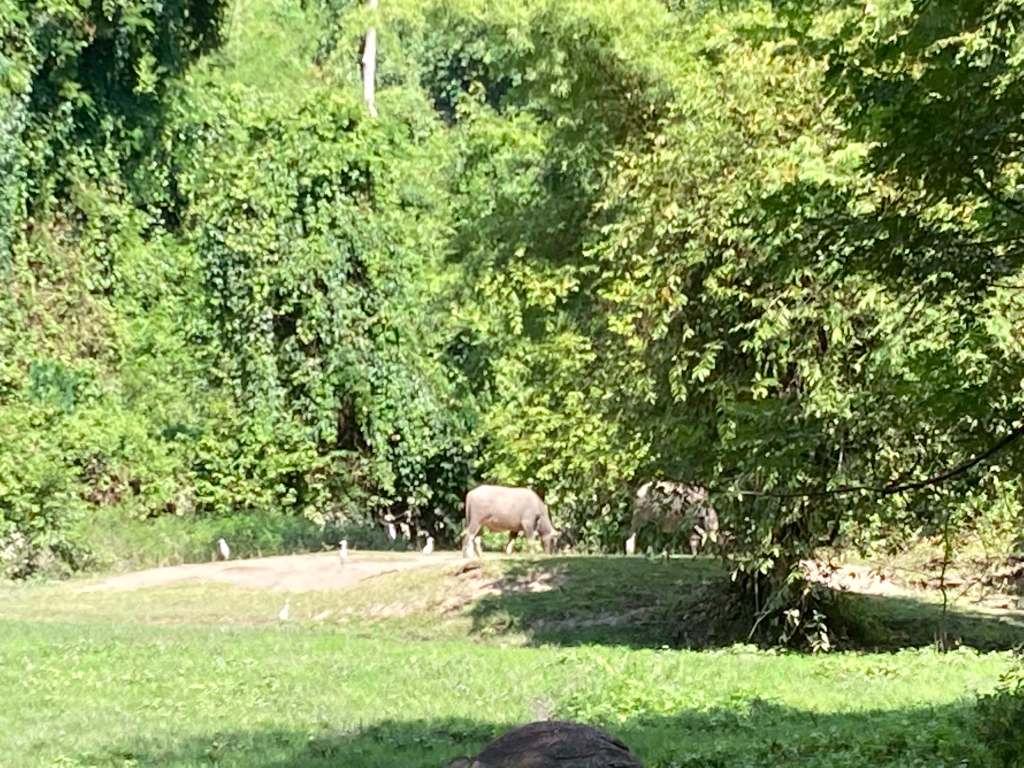 The post-swim cycle back was a magical trip through a storybook forest alight with dragonflies and butterflies the size of bats. Farms as far as the eye can see. Trees stretched their knotted fingers across the sky, reaching out to their forest home. Water buffalo perfected their languid gait amid slender white egrets praising their efforts. There’s something so sweetly beauty-and-the-beast-like about the way these two animals coexist in rural Thailand.
