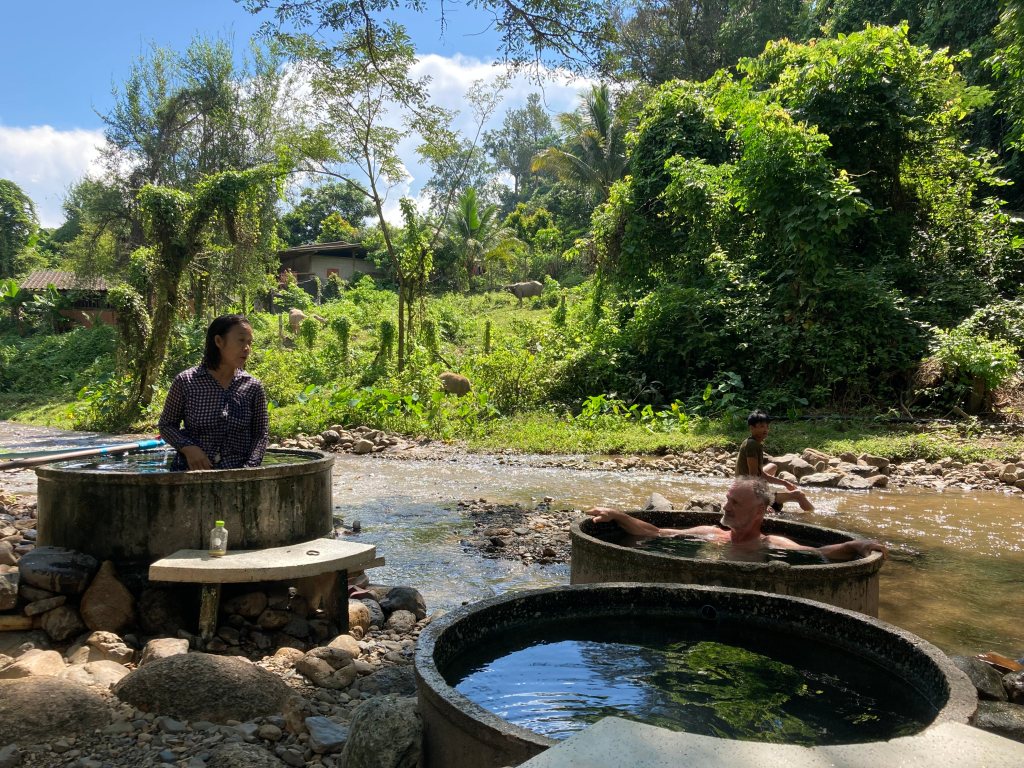 After breakfast, I placed my sore ass gingerly atop my bicycle seat, and Bert and I cycled 7km to the hot springs. ‘Twas a chirpy morning as we rolled down the potholed road bedecked with shade pockets and fallen leaves––and a couple of scary dogs for good measure. We arrived at the giant concrete cauldrons of steamy sulfurous water, positioned next to a babbling river. The whole set up was an onsen spa, au naturel version. We indulged in a little fantastic fungi and spent a few hours hopping from river to barrel and back again, chatting with local sarong-swathed families.