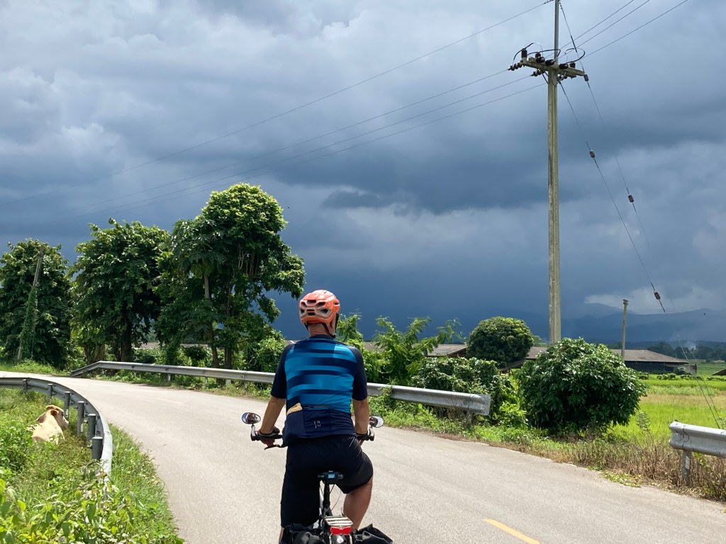 The return trip to Chiang Mai was marveloso. It was––dare I say it––easy. We smashed out 45 km in just 2 hours, and it was a hilly 45 km, alongside muddy rivers. For whatever reason––maybe it was the cooler air and overcast sky––the whole first half of the journey back was effortless. Then we hit the flat roads, the sun shone thick and hot, and thunder rumbled off in the distance. We cycled toward a black sky and managed to miss the serious rain by about 10 minutes. Phew.